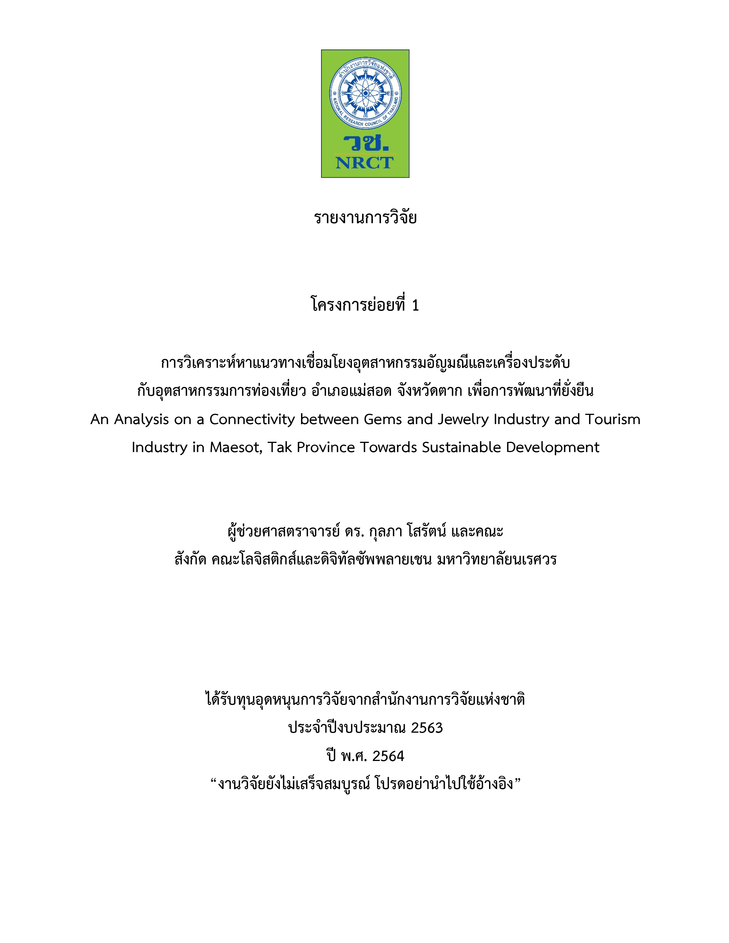 การวิเคราะห์หาแนวทางเชื่อมโยงอุตสาหกรรมอัญมณีและเครื่องประดับกับอุตสาหกรรมการท่องเที่ยว อำเภอแม่สอด จังหวัดตาก เพื่อการพัฒนาที่ยั่งยืน